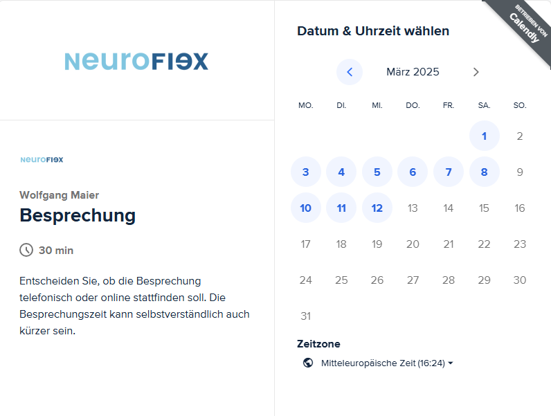 Termine Sie möchten einen Termin in der Neuroflex-Agenda von Wolfgang Maier buchen? Wir freuen uns auf Ihre Kontaktaufnahme. Online einen Termin buchen So funktioniert's: Besprechung 30 Minuten (1) Suchen Sie sich in meinem Kalender einen passenden Termin für unsere Besprechung aus.(2) Sie können im Anschluss wählen, ob die Besprechung telefonisch oder online stattfinden soll.Die Besprechungszeit kann selbstverständlich auch kürzer sein.(Details werden bei Abschluss der Buchung zur Verfügung gestellt) Jetzt buchen